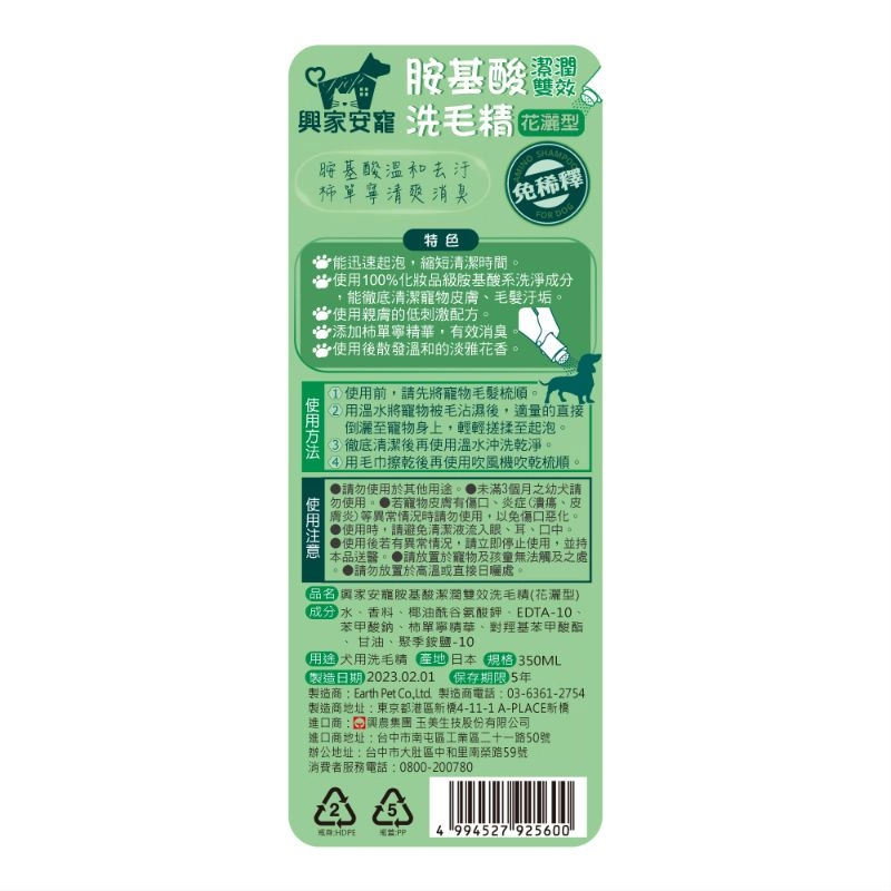 - 品名:興家安寵 胺基酸潔潤雙效洗毛精(花灑型)