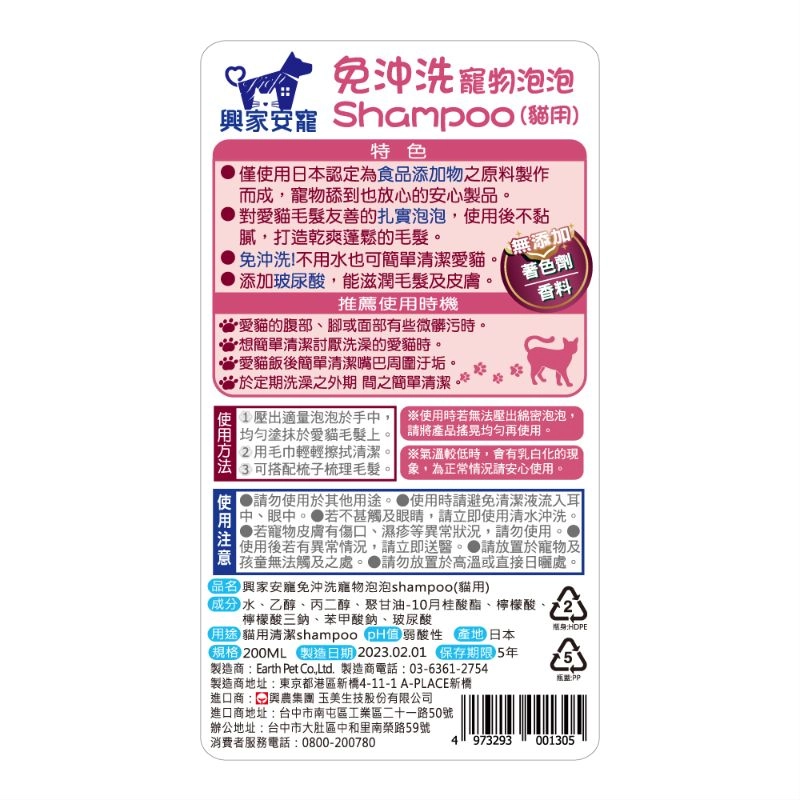 - 品名:興家安寵免沖洗寵物泡泡shampoo(貓用)