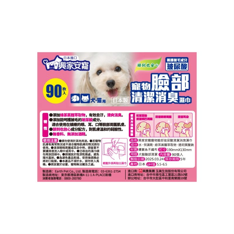 - 品名:興家安寵寵物臉部玻尿酸清潔消臭濕巾