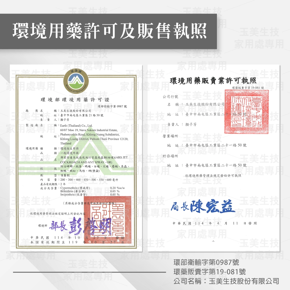 - 許可證字號:環署衛輸字第0987號 、環藥販賣字第19-081號