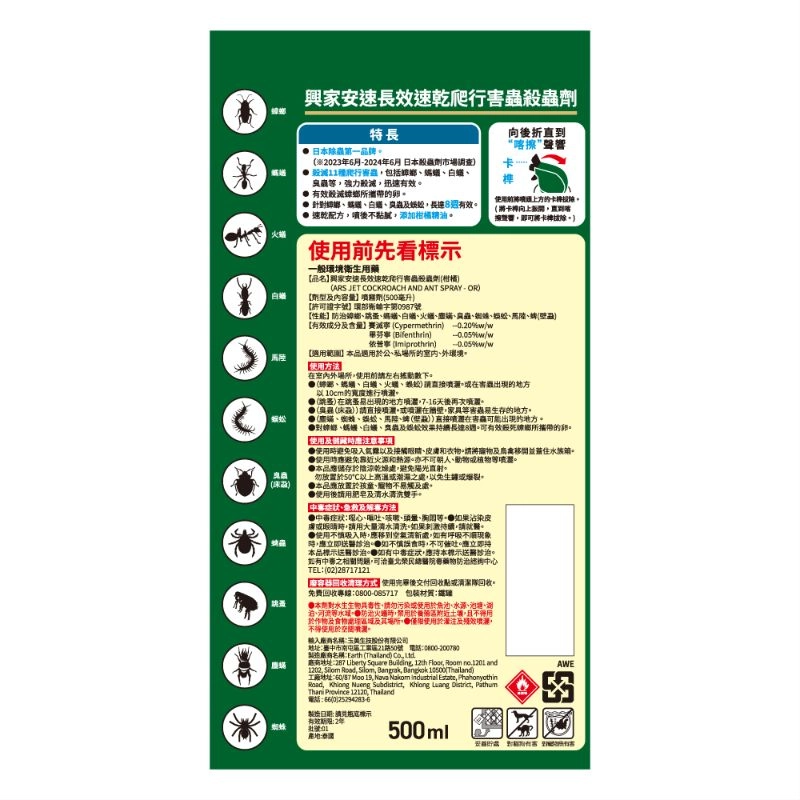 (ARS JET COCKROACH AND ANT SPRAY - OR) - 許可證字號:環署衛輸字第0987號 、環藥販賣字第19-081號