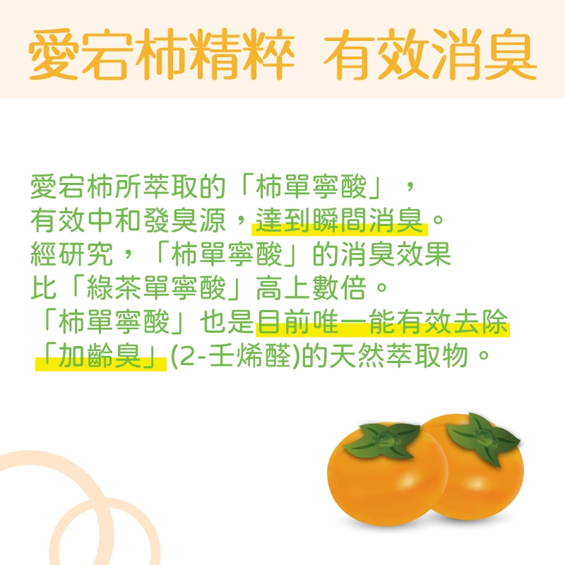 - 獨特的柿子萃取,有效去除加齡臭味道