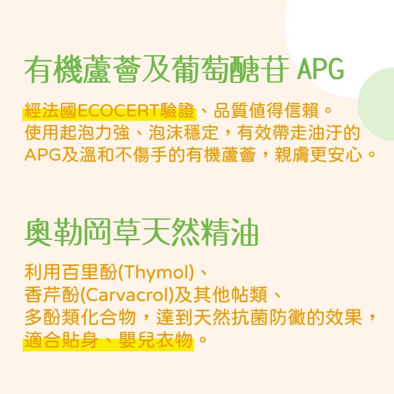 - 成分:去離子水、倍蘇打、有機蘆薈萃取液、植物萃取液、柿子萃取液、天然鳳梨酵素、天然甘露聚糖酶、天然澱粉酵素、天然纖維酵素、天然脂肪酵素、天然椰油醇醚硫酸鈉、天然癸基葡萄糖苷、天然椰油醯胺丙基甜菜鹼、草本植物香氣、奧勒岡草精油、葡萄糖酸氯己定、二氧化碳