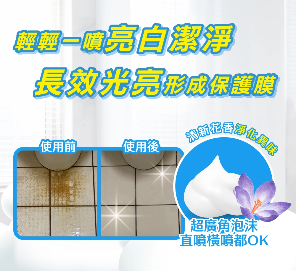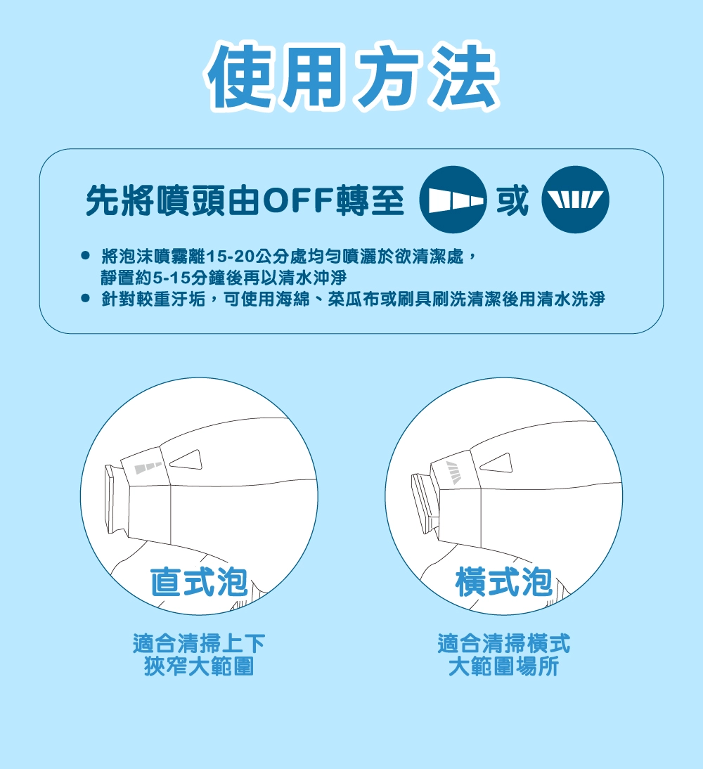 - 將泡沫噴霧離15-20公分處均勻噴灑於欲清潔處,靜置約5-15分鐘後再以清水沖淨。