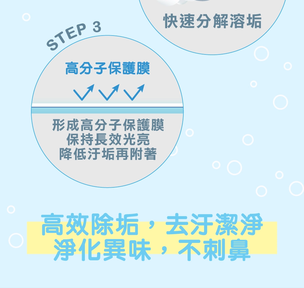 - 長效光亮:添加高分子保護膜,有效減少污垢附著,洗淨更省力