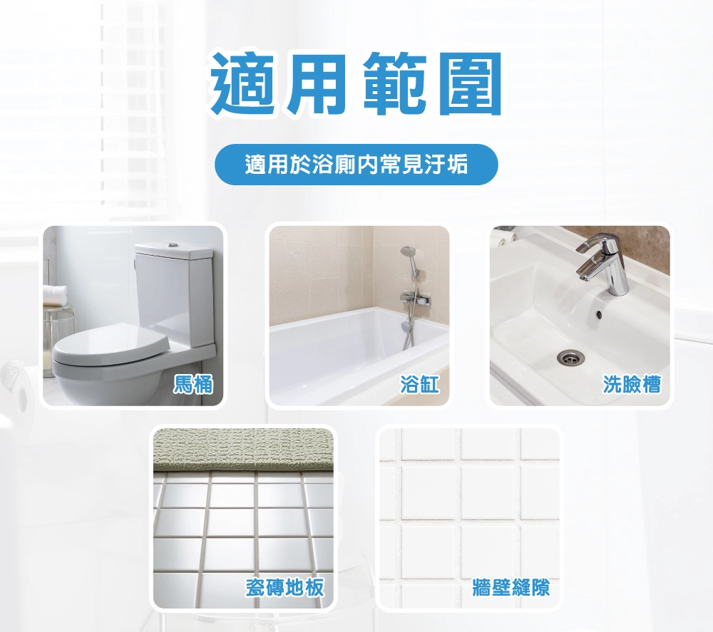 - 用途:去除浴廁內之尿垢、皂垢等一般汙垢