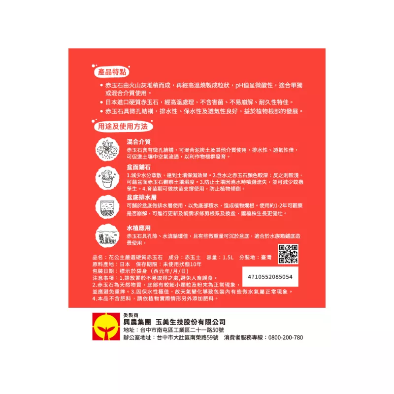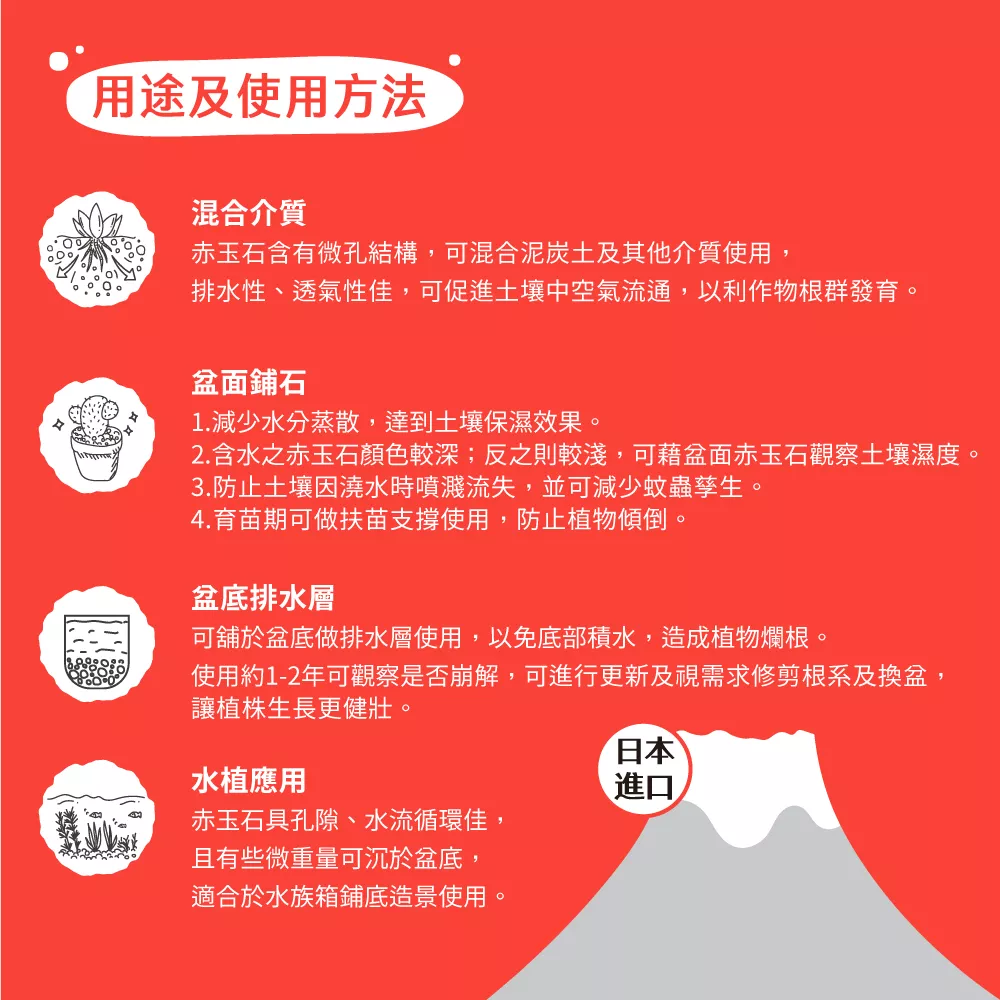 - 日本進口硬質赤玉石,經高溫處理,不含害菌、不易崩解、耐久性特佳