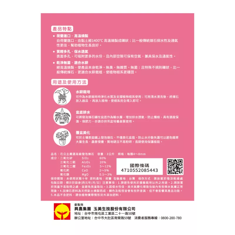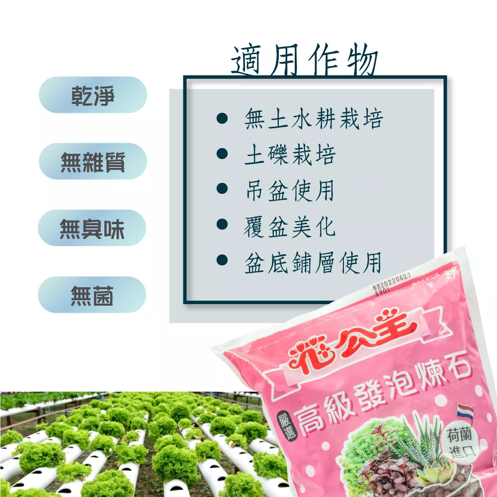 - 自荷蘭進口,由黏土經1400℃高溫燒製成礫狀,保水性及通氣性更佳