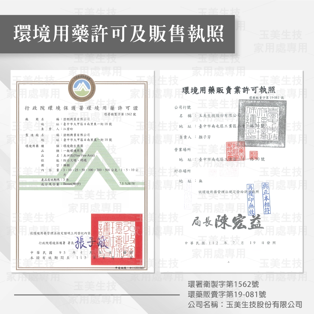 - 許可證字號︰環署衛製字第1562號 、環藥販賣字第19-081號