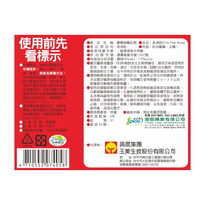 - 品名:興農殺蟻粒劑(美洲豹(Fire Fire-Ants))